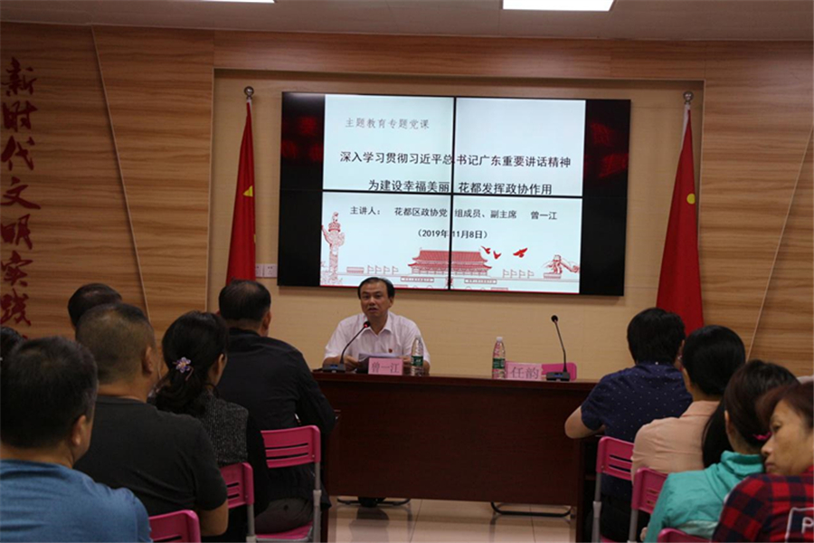 根据花都区“不忘初心、牢记使命“主题教育要求,区政协党组成员、副主席曾一江于2019年11月8日到花城街梅花社区为广大党员上了一堂以“深入学习贯彻习近平总书记视察广东重要讲话精神,为建设幸福美丽花都发挥政协作用”为主题,内涵丰富、生动鲜活、党员群众喜闻乐见的党课。