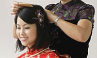 嵌床(ベッドという意味)とは、新郎新婦の部屋に入り、ベッドに布団を敷きながら、縁起の良い歌を歌うことである。布団の中に蓮子の木、蓮珠蓮子20齊があり、ベッドの四角にそれぞれ母子つながりのサトイモ(子沢山という意味)を置き、甘酒、ショウガ、赤い卵、谷、米、ダイズ(種があるという意味)と銅盆靴(末永くという意味)、食器、はさみ、物差し(食べる物と着る物が十分あるという意味)なども置く。引き続き、「案兄弟」は新郎に中国式の長い服を着させ、胸や背中に刺繍入りの玉をかけ、金花礼装用の帽子をかぶらせ、「簪花挂灯」という。新婦側の実家は「運の良いおばあさん」に頼んで、新婦に髪を結ってもらう。ただ3回だけでいい、3回ときながら、縁起の良い話をする。実家の門を出る時、新婦の母親は新婦に赤い細ひもで99枚の銅銭を「銭剣」を渡す。