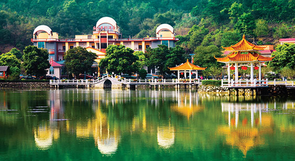 紅山村内に森林の2 万畝以上があり、空気は新鮮で、酸素イオン含有量はとても高くて、山と水の優れた風景のある場所である。その中にアブラナ、桃花があり、観光地内にまた深谷の滝、紅谷の滝、石上背の滝、浅谷の滝、銅鼓潭の滝等という五つの滝、及び銅鼓鼎山頂公園、紅豆杉文化園等がある。現有の緑道20キロ以上は観光客の歩行活動に提供されている。紅山村は自転車租借サービス、客家特色のある農家レストランん、客家特産市場、客家特色軽食風情街を持っている。