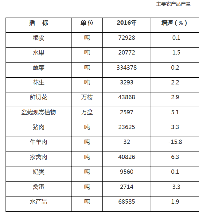 2016年全区实现农业总产值60.70亿元,比上年增长2.5%。其中,种植业产值30.32亿元,增长1.4%;林业产值0.31亿元,增长0.8%;畜牧业产值16.94亿元,增长5.9%;渔业产值8.03亿元,增长2.4%;农林牧渔服务业产值5.10亿元,增长3.5%。