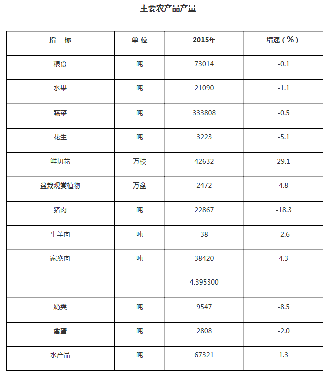 全年农作物播种面积48.85万亩,比上年下降1.6%;水果种植面积5.37万亩,下降0.5%。农作物中,粮食作物播种面积22.00万亩,与去年持平;蔬菜种植面积19.78万亩,下降3.7%;花卉种植面积2.67万亩,同比增长4.6%。