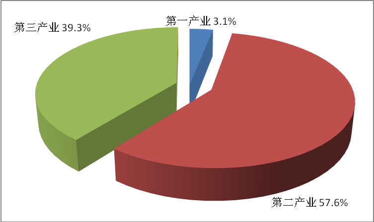 第一产业增加值31.39亿元,增长2.4%;第二产业增加值578.03亿元,增长8.8%;第三产业增加值393.70亿元,增长14.3%。三次产业结构比重为3.1:57.6:39.3,第一产业和第二产业比重较去年同期分别下降0.2和1.4个百分点,第三产业上升1.6个百分点。三次产业对经济增长的贡献率依次为0.7%、52.0%和47.3%,对经济的拉动作用分别为0.1、5.4和5.0个百分点。