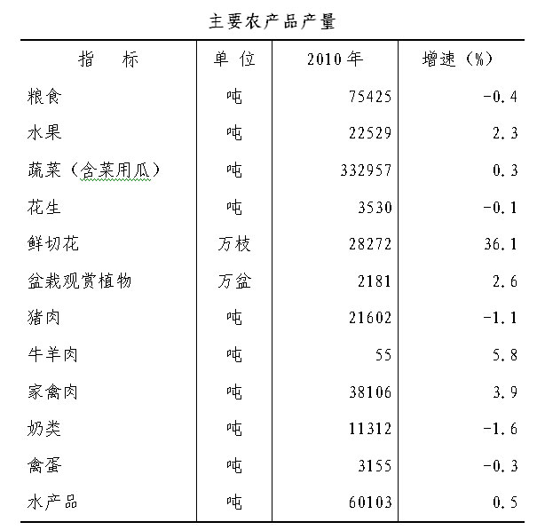 2010年全区农业总产值43.90亿元,比上年增长2.0%。其中,种植业产值22.71亿元,增长1.4%;林业产值0.30亿元,增长21.7%;畜牧业产值11.65亿元,增长1.9%;渔业产值6.59亿元,增长2.5%;农业服务业产值2.65亿元,增长4.4%。