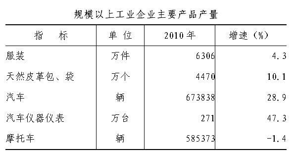 支柱行业带动作用明显。汽车制造业产值更是突破千亿,达1068.66亿元,比上年增长30.2%,汽车行业产值占全区工业总产值的67.7%,比重较上年提高了5.8个百分点。规模以上企业中,交通运输设备制造业,皮革、毛皮、羽毛(绒)及其制品业,金属制品业,纺织服装、鞋、帽制造业和纺织业五大制造业总计完成工业总产值1220.26亿元,占规模以上工业总产值的83.1%。(一)交通运输设备制造业产值1082.55亿元,同比增长28.7%,其中:汽车整车产值831.81亿元,增长29.1%;汽车零部件企业产值236.85亿元,增长34.4%。(二)皮革、毛皮、羽毛(绒)及其制品业全年产值44.84亿元,增长16.7%。(三)金属制品制造业产值35.56亿元,增长17.4%。(四)纺织服装、鞋、帽制造业产值28.57亿元,增长7.9%。(五)纺织业产值28.74亿元,增长7.9%。