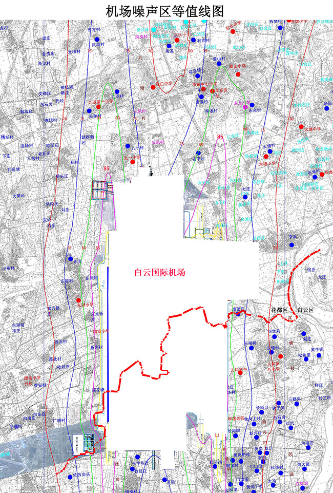 根据原国家环保总局和广东省环保厅对广州白云国际机场扩建工程《环境影响报告书》批复的要求及广州市人民政府常务会议的决定,广州白云国际机场噪声区治理范围为噪声85分贝等值线区域范围内(附图:机场噪声85分贝等值线图)。其中涉及我区花东镇山下村、七庄村,花山镇东湖村,新华街团结村。