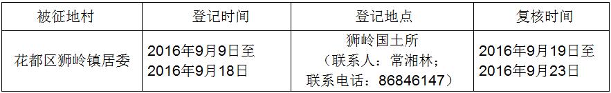 经省人民政府批准(粤国土资(建)字[2016]251号文),需将广州市花都区狮岭镇居委属下的集体土地0.3376公顷(合5.0640亩)征收为国有土地。现将经依法批准的《征收土地方案》和市人民政府批准的《征地补偿安置方案》内容和有关事项公告如下: