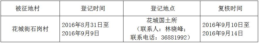 经省人民政府批准(粤国土资(建)字〔2016〕183号文),需将广州市花都区花城街石岗村属下的集体土地4.2898公顷(合64.3470亩)征收为国有土地。现将经依法批准的《征收土地方案》和市人民政府批准的《征地补偿安置方案》内容以及有关事项公告如下: