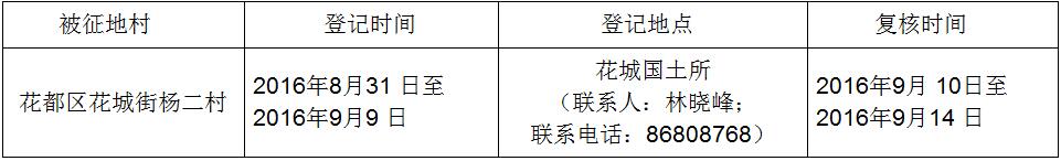 经省人民政府批准(粤国土资(建)字[2016]411号文),需将花都区花城街杨二村属下的集体用地0.6946公顷(合10.4190亩)征收为国有土地。现将经依法批准的《征收土地方案》和市人民政府批准的《征地补偿安置方案》内容和有关事项公告如下: