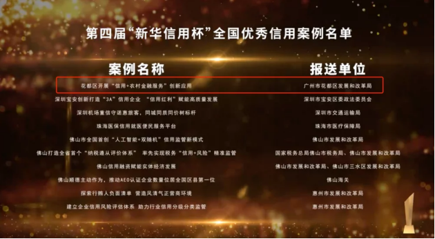 1月4日,第四届中国城市信用建设高峰论坛在北京和广州两地联动举办。现场公布了第四届“新华信用杯”全国优秀信用案例和信用应用场景优秀微视频评选结果。“花都区开展‘信用+农村金融服务’创新应用”案例成功获评为全国优秀信用案例。