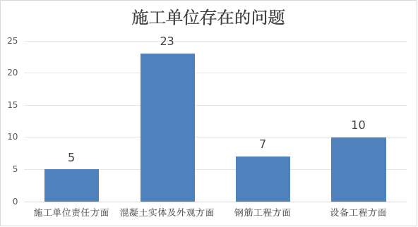 2.混凝土实体及外观方面:共发现23个问题。其中9个项目的剪力墙侧墙梁侧、板底等有开裂渗漏现象;10个项目的梁底、柱混凝土、楼梯休息平台板底等有涨模、蜂窝、夹渣、漏浆现象;2个项目的楼板有露筋现象;2个项目新旧混凝土交接处,有较多松散混凝土、垃圾未清理干净。