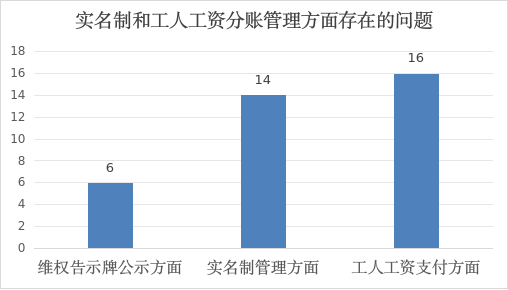 3.工人工资支付方面:共发现16个问题。其中4个项目存在工资表代签情况;2个项目建设单位未及时向工人工资专户拨款;2个项目存在施工单位向工人工资专户进行拨款的情况;2个项目工人工资发放不及时;2个项目工人工资占比不满足要求;2个项目用工合同单价与社会用工均价不符;1个项目未足额发放工人工资;1个项目建设单位提供的工程款支付担保不符合要求。