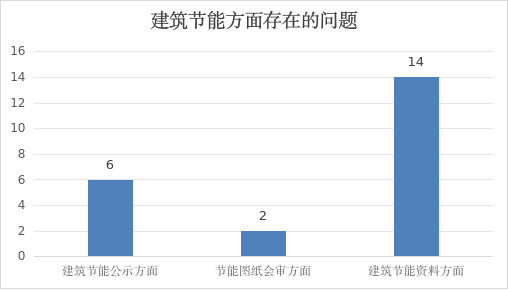 3.建筑节能资料方面:共发现14个问题。其中5个项目未提供过审的绿色建筑节能设计专篇;5个项目未提供建筑节能方面的施工日志或旁站记录;4个项目的节能施工方案、节能监理细则内容没有针对性,未对应节能专篇内容进行编制。